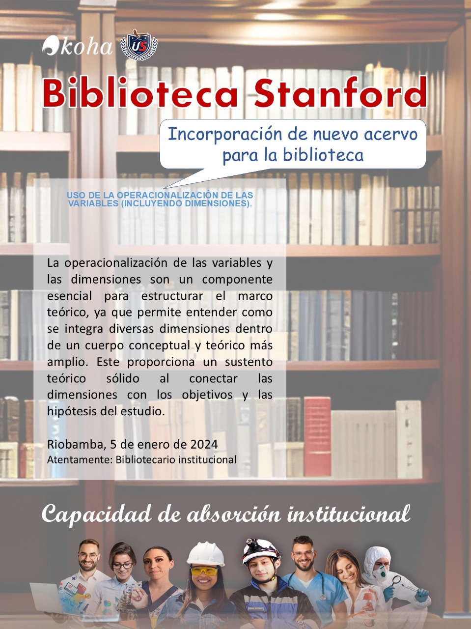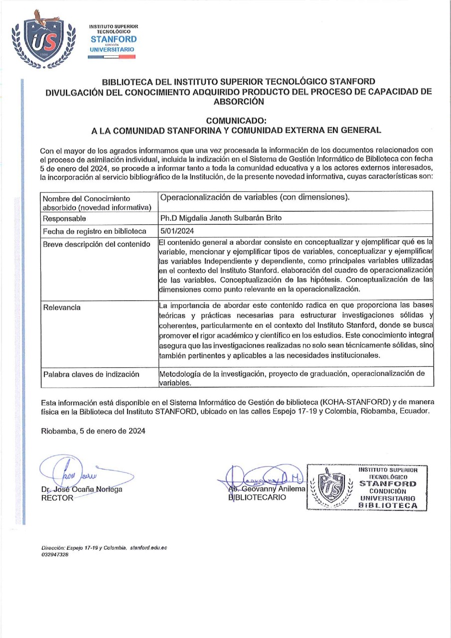 El contenido general a abordar consiste en conceptualizar y ejemplificar qué es la variable, mencionar y ejemplificar tipos de variables, conceptualizar y ejemplificar las variables Independiente y dependiente, como principales variables utilizadas en el contexto del Instituto Stanford. elaboración del cuadro de operacionalización de las variables. Conceptualización de las hipótesis. Conceptualización de las dimensiones como punto relevante en la operacionalización.