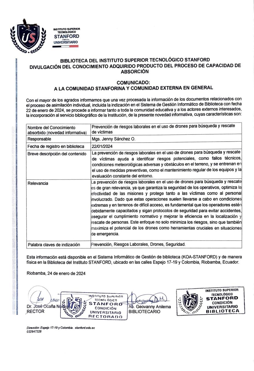 Relevancia La prevención de riesgos laborales en el uso de drones para búsqueda y rescate es de gran relevancia, ya que garantiza la seguridad de los operativos, optimiza la efectividad de las misiones y protege tanto a las víctimas como al personal involucrado. Dado que estas operaciones suelen llevarse a cabo en condiciones extremas y en terrenos de difícil acceso, es fundamental que los operadores estén debidamente capacitados y sigan protocolos de seguridad para evitar accidentes, asegurar el cumplimiento normativo y mejorar la eficiencia en la localización y rescate de personas. Este enfoque no solo minimiza los riesgos, sino que también maximiza el potencial de los drones como herramientas cruciales en situaciones de emergencia.