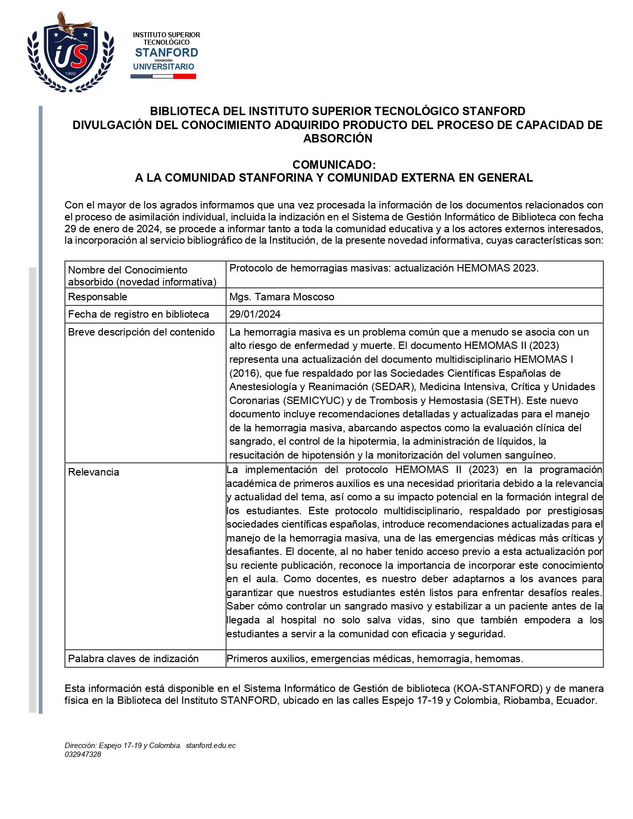 La implementación del protocolo HEMOMAS II (2023) en la programación académica de primeros auxilios es una necesidad prioritaria debido a la relevancia y actualidad del tema, así como a su impacto potencial en la formación integral de los estudiantes. Este protocolo multidisciplinario, respaldado por prestigiosas sociedades científicas españolas, introduce recomendaciones actualizadas para el manejo de la hemorragia masiva, una de las emergencias médicas más críticas y desafiantes. El docente, al no haber tenido acceso previo a esta actualización por su reciente publicación, reconoce la importancia de incorporar este conocimiento en el aula. Como docentes, es nuestro deber adaptarnos a los avances para garantizar que nuestros estudiantes estén listos para enfrentar desafíos reales. Saber cómo controlar un sangrado masivo y estabilizar a un paciente antes de la llegada al hospital no solo salva vidas, sino que también empodera a los estudiantes a servir a la comunidad con eficacia y seguridad.