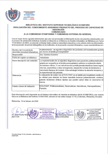 La implementación de un algoritmo diagnostico para pacientes politraumatizados guiado por ecografía en el ámbito prehospitalario optimiza la evaluación rápida de lesiones críticas. El uso del ultrasonido portátil permite identificar hemorragias internas, neumotórax y otras emergencias, mejorando la toma de decisiones y reduciendo tiempos de traslado. Esta estrategia fortalece la atención temprana y la supervivencia del paciente